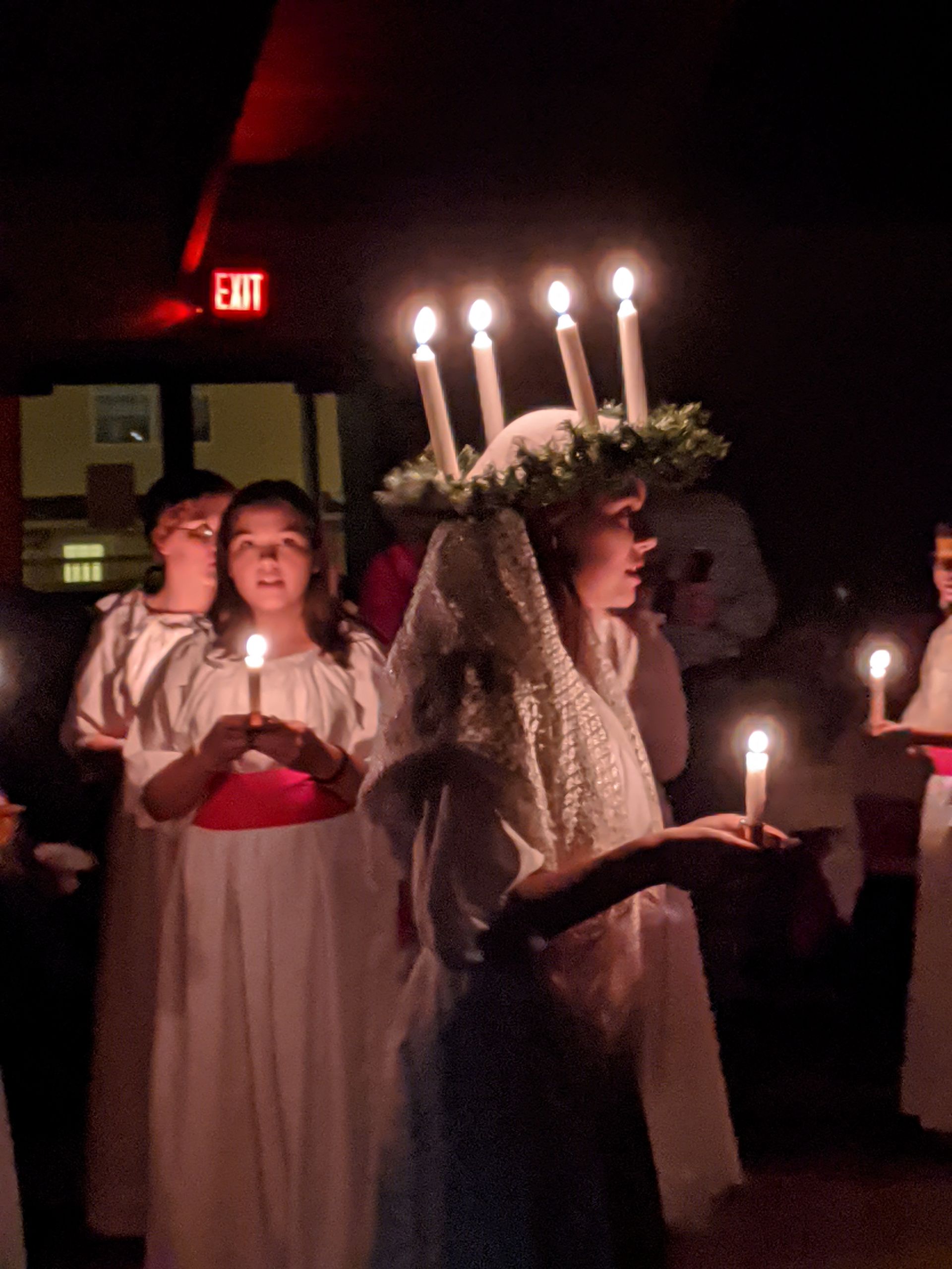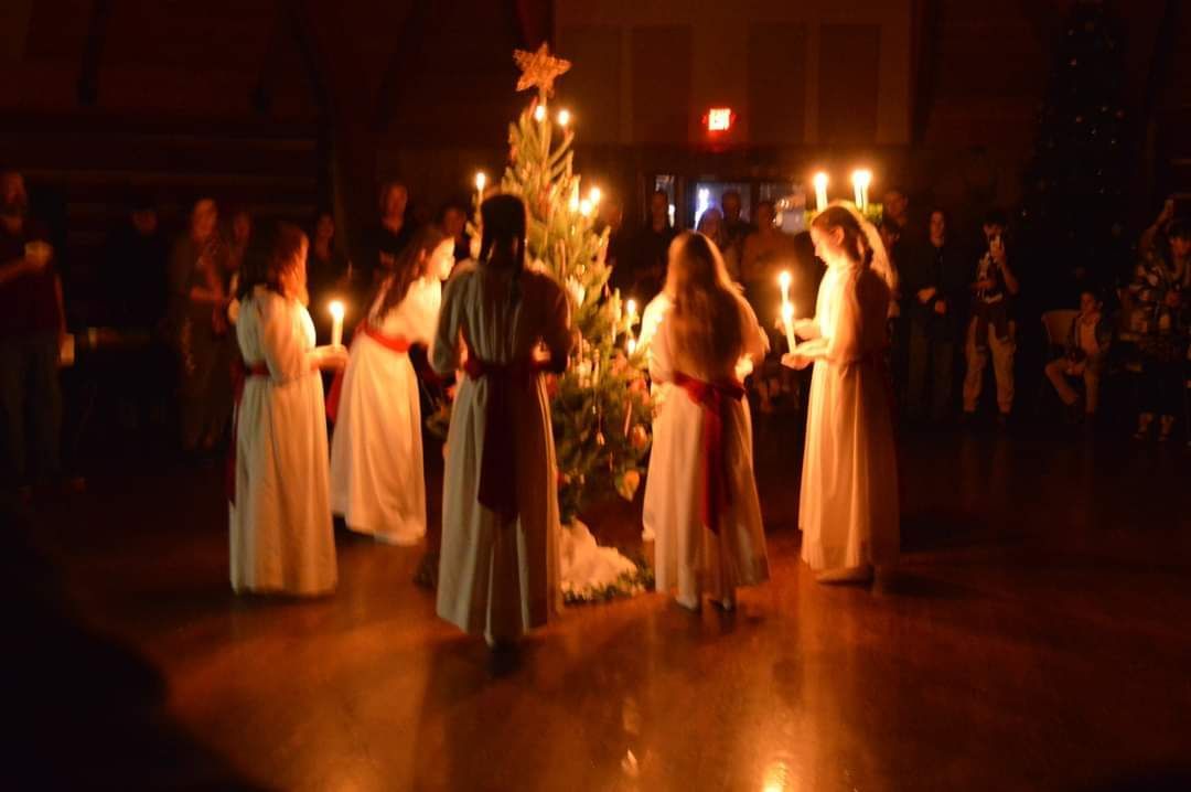 The lights go out, and a hush falls on the room as a solo voice rings out. A hundred people hold their breath as a door opens in the corner and flickering candlelight is seen. Ten or twelve teenage girls dressed in white, their lovely faces just barely visible above the candles they hold, emerge from the storage room hidden behind the fireplace.